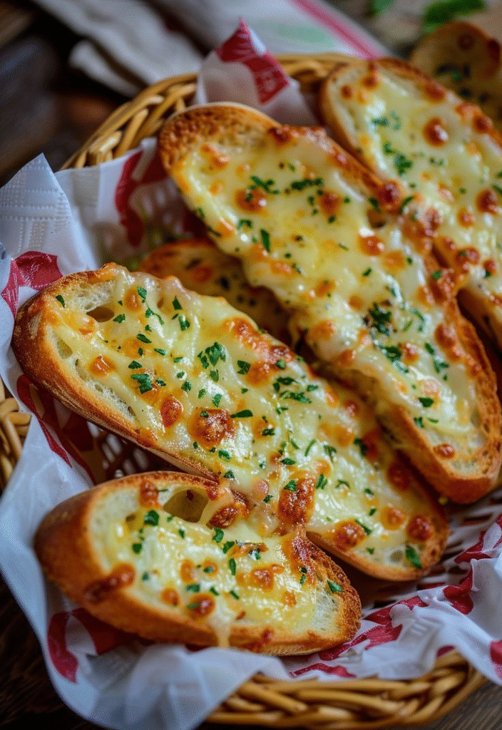 This classic side dish features crusty bread slathered in a buttery garlic spread and topped with melty cheese.